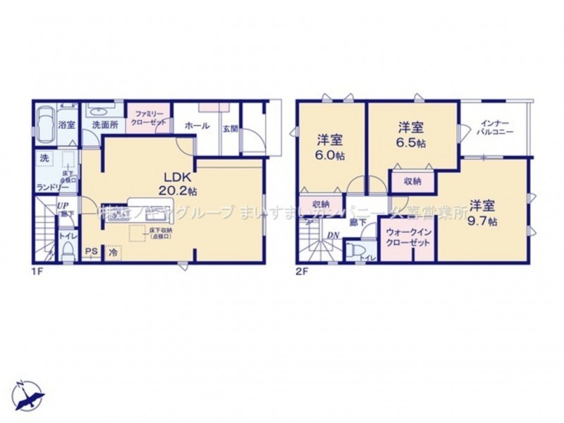 | 設備・条件 | システムキッチン、カウンターキッチン、シャンプードレッサー、浴室乾燥機、モニタ付インターホン、洗浄便座、Wクロゼット、複層ガラス、追い炊き、駐車場2台分、床下収納、トイレ2箇所 | ||